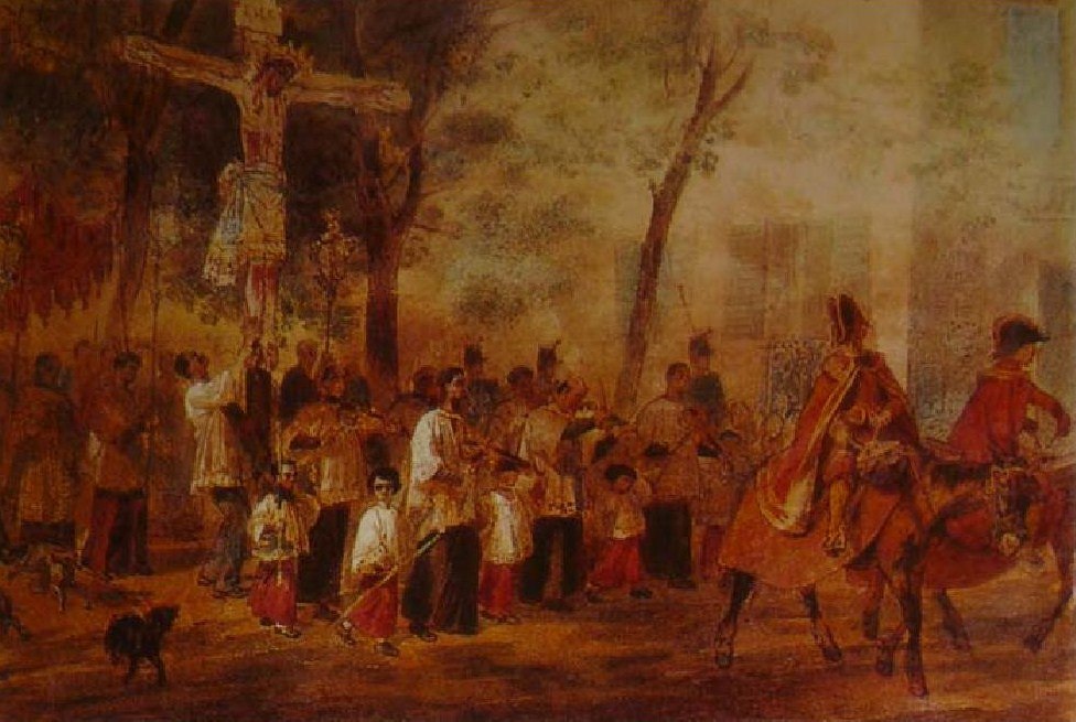 Карл Брюллов в своей картине «Процессия слепых в Барселоне» представляет зрителю шествие, которое он наблюдал в Барселоне: по улице движется процессия слепых музыкантов. Здесь нет духа праздника, который свойственен таким шествиям. Художник показывает своё сострадание этим несчастным людям, которых сопровождают нужда, страдания и горечь. Распятие Христа, возвышающееся над головам этих несчастных людей, показывает их единственную надежду в этом мире.