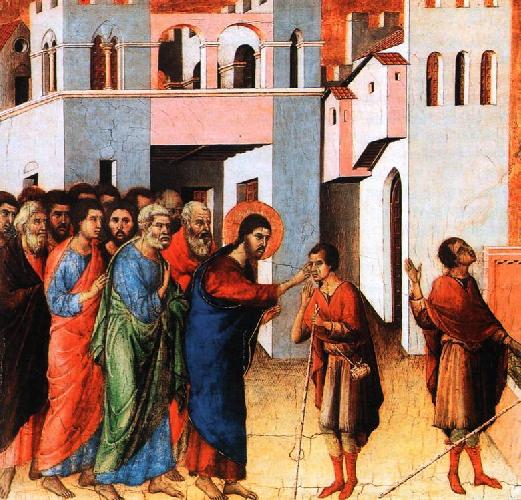 Картина итальянского художника XIV века Дуччо ди Буонинсенья изображает библейский момент исцеления слепого Иисусом Христом. На картине Христос исцеляет двух слепых: первый уже получил исцеление и благодарит Бога, к глазам второго Иисус прикасается, а Его ученики внимательно наблюдают за происходящим