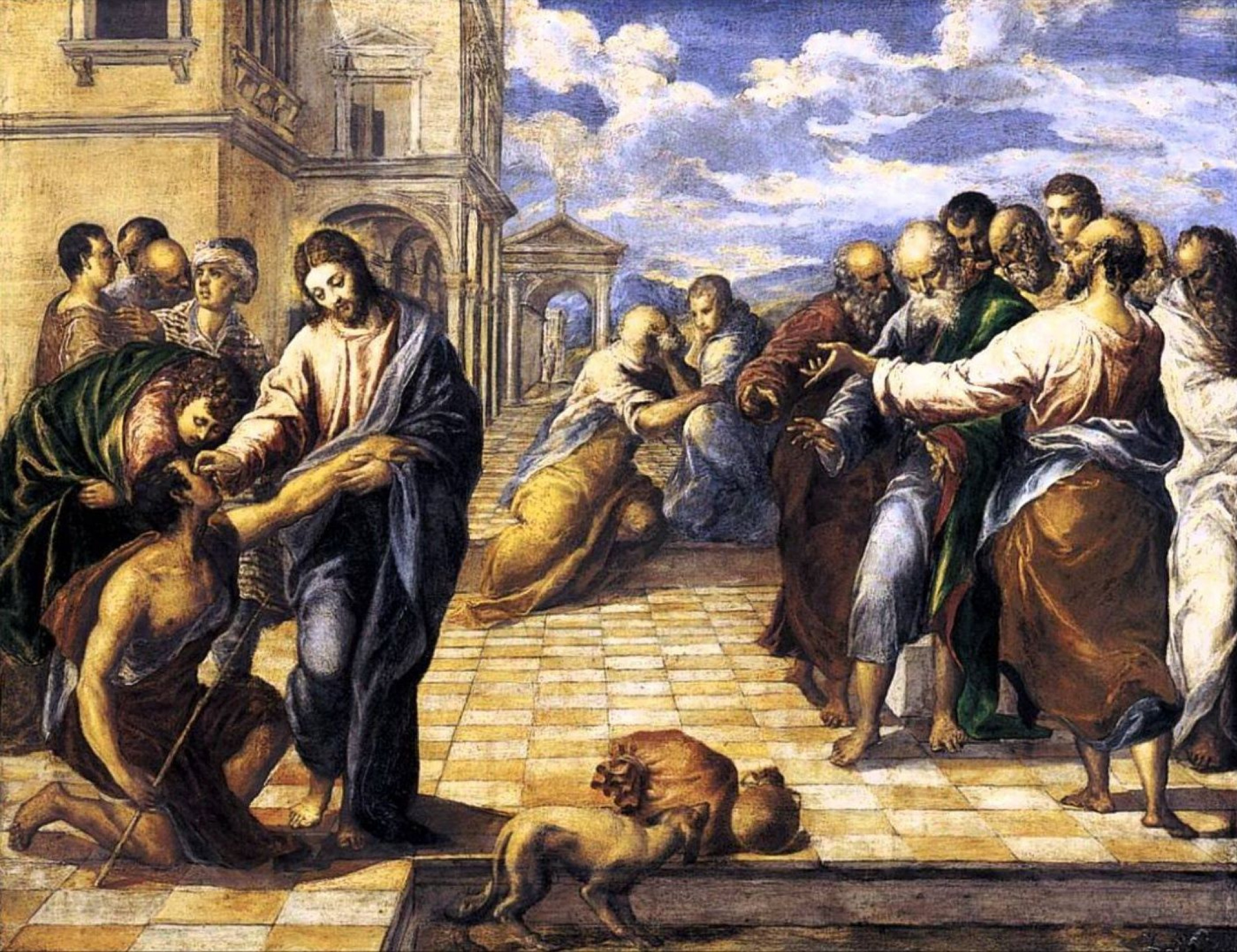 «И, проходя, увидел человека, слепого от рождения. Ученики Его спросили у Него: Равви! кто согрешил, он или родители его, что родился слепым? Иисус отвечал: не согрешил ни он, ни родители его, но [это для] [того], чтобы на нем явились дела Божии. Мне должно делать дела Пославшего Меня, доколе есть день; приходит ночь, когда никто не может делать. Доколе Я в мире, Я свет миру. Сказав это, Он плюнул на землю, сделал брение из плюновения и помазал брением глаза слепому, и сказал ему: пойди, умойся в купальне Силоам, что значит: посланный. Он пошел и умылся, и пришел зрячим»
