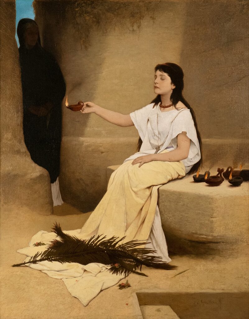 Картина Габриэля Макса «Слепая продавщица светильников при входе в катакомбы» глубоко эмоциональна. Она изображает женщину, слепую по болезни, которая в темных подземельях подает светильники. Её лицо освещено не только светом светильников, но и её внутренним духовным светом. Эта слепая девушка распространяет свет, она видит больше тех зрячих, кто избрал тьму.