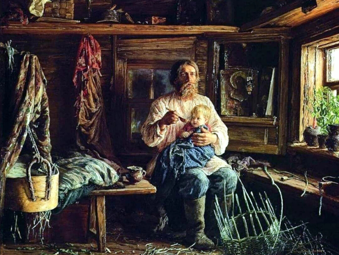 В картине Василия Максимовича Максимова «Слепой хозяин» изображен cлепой мужчина, который кормит ребёнка. В комнате беспорядок, который часто сопровождает жизнь незрячих людей.